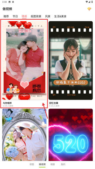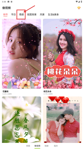 2、在視頻制作功能頁面,選擇情感分類,瀏覽情感類視頻模板列表。
