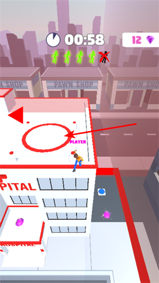 4、完成區(qū)域目標(biāo),樓頂?shù)募t色圓環(huán)區(qū)域完成互動或任務(wù),達(dá)成區(qū)域目標(biāo),獲取獎勵,解鎖區(qū)域。