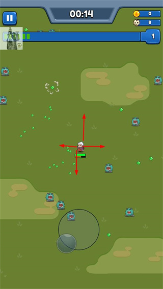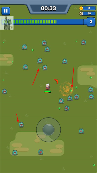 1、操控角色在地圖中移動,收集綠色晶體資源,同時攻擊藍(lán)色怪物,提升等級。