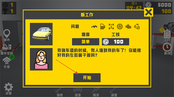 1、在游戲界面看到新工作提示,了解任務(wù)是修理左后翼子板,難度簡單,工錢100,點(diǎn)擊開始。