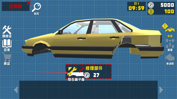 3、拆卸后,點(diǎn)擊出現(xiàn)的修理部件后左翼子板按鈕,花費(fèi)對(duì)應(yīng)費(fèi)用進(jìn)行修理操作。