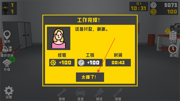 4、完成修理,出現(xiàn)工作完成!提示,查看獲得的經(jīng)驗(yàn)和工錢,點(diǎn)擊太棒了!接收?qǐng)?bào)酬并繼續(xù)下一個(gè)工作。