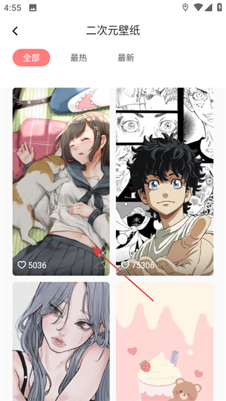 2、在二次元壁紙頁(yè)面,選擇喜歡的壁紙,進(jìn)入該壁紙?jiān)斍轫?yè)面。