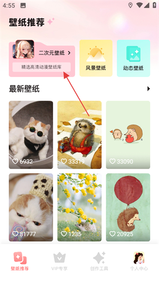1、在壁紙推薦頁(yè)面,點(diǎn)擊二次元壁紙,進(jìn)入二次元壁紙頁(yè)面。