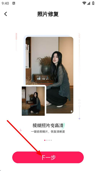 1、在APP頁面,點擊照片修復(fù),進(jìn)入照片修復(fù)引導(dǎo)頁面。