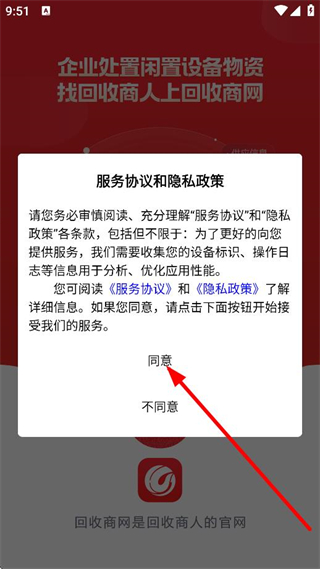 1、在服務(wù)協(xié)議和隱私政策彈窗中,點(diǎn)擊同意,進(jìn)入回收商網(wǎng)APP主頁面。