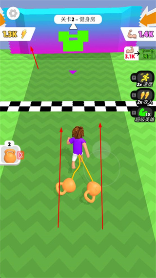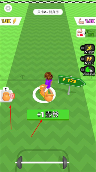 1、在健身房關卡,收集壺鈴等健身道具,這是獲取資源的關鍵操作,為提升屬性提供助力。