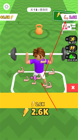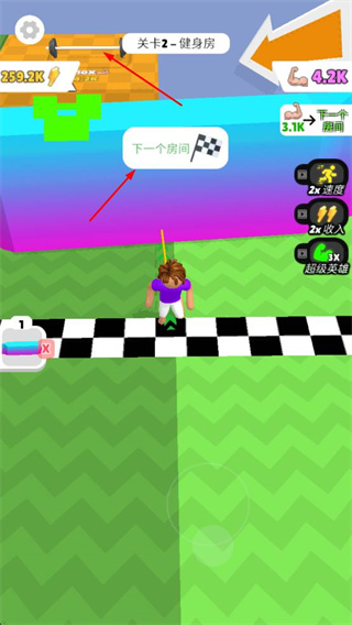 2、收集道具后,沿著路徑前往關卡終點,完成階段挑戰(zhàn),積累能量值和肌肉屬性。