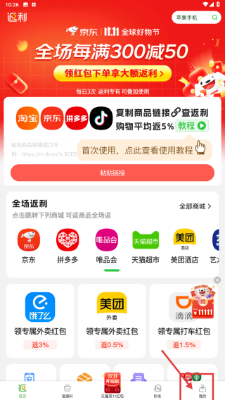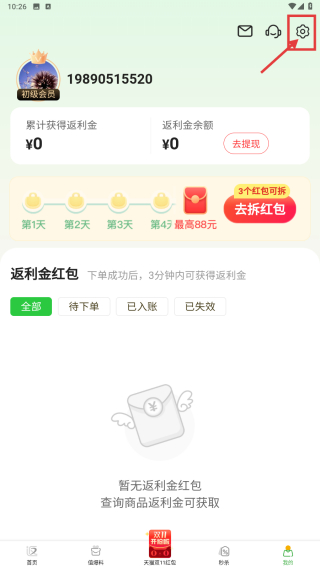 1、打開(kāi)返利類(lèi)應(yīng)用,點(diǎn)擊底部我的選項(xiàng),進(jìn)入個(gè)人中心頁(yè)面。