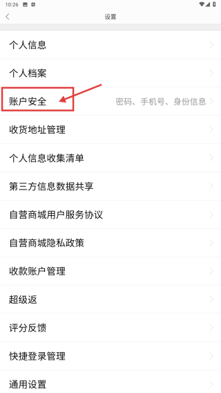 3、在設(shè)置界面,點(diǎn)擊賬戶(hù)安全選項(xiàng),查看賬戶(hù)安全相關(guān)設(shè)置。