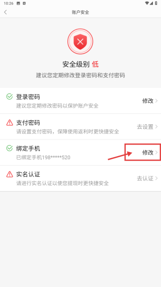 4、在賬戶(hù)安全頁(yè)面,點(diǎn)擊綁定手機(jī)后的修改按鈕,進(jìn)行手機(jī)號(hào)修改操作。