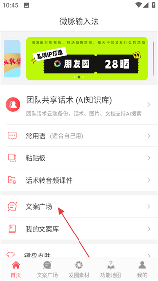 1、進入微脈輸入法首頁,點擊文案廣場,進入文案廣場頁面。