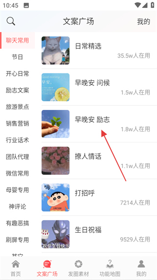 2、在文案廣場頁面,選擇想要的文案分類,如早晚安勵志,進入該分類文案頁面。