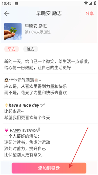 3、在分類文案頁面,若想使用某條文案,點擊添加到鍵盤,可將文案添加到鍵盤方便使用。