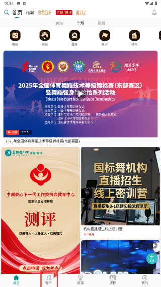 1、打開舞蹈類應(yīng)用,點(diǎn)擊底部音樂選項(xiàng),進(jìn)入音樂板塊。