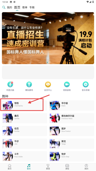 2、在音樂頁面,點(diǎn)擊恰恰舞種分類,查看恰恰舞相關(guān)音樂。