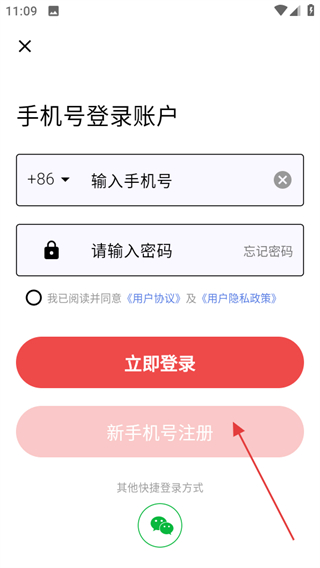 3、在登錄頁面,若需注冊新賬號,點擊新手機號注冊,進(jìn)入新手機號注冊頁面。