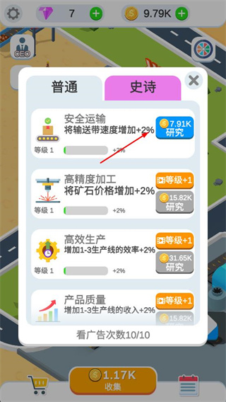 2、在研究界面,消耗資源升級(jí)安全運(yùn)輸、高精度加工等技能,提升生產(chǎn)線效率和資源價(jià)值,增加金幣收入。