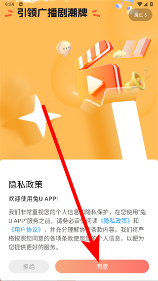 1、打開(kāi)兔U廣播劇,在彈出的隱私政策彈窗中點(diǎn)擊同意。