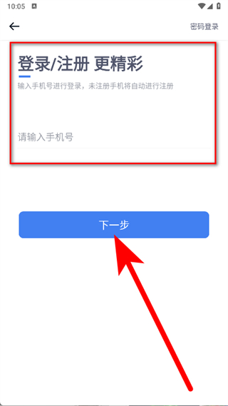 3、在手機號輸入界面,輸入要登錄的手機號碼,點擊下一步。