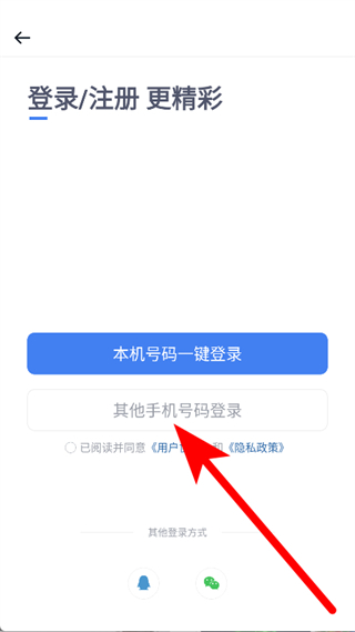 2、在登錄注冊頁面,點擊其他手機號碼登錄按鈕。