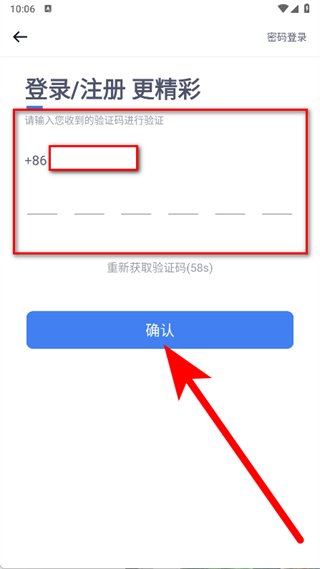 4、在驗證碼驗證頁面,輸入收到的驗證碼,接著點擊確認,完成注冊登錄。