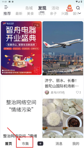 1、打開本地生活類應(yīng)用,點(diǎn)擊底部市集選項(xiàng),進(jìn)入市集板塊。