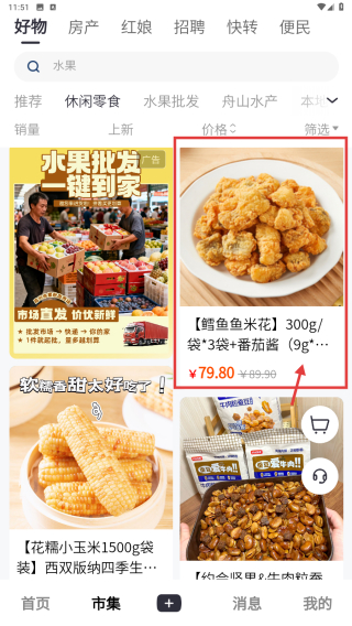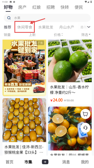 2、在市集頁面,點(diǎn)擊休閑零食分類標(biāo)簽,篩選休閑零食類商品。