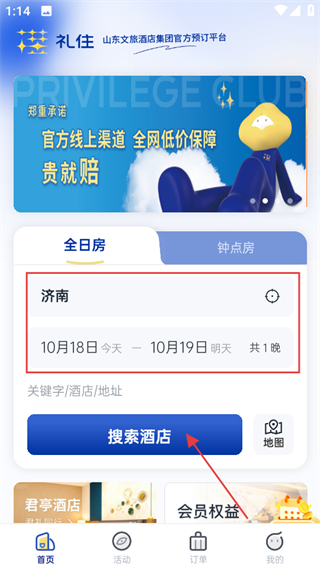 1、進入禮住,在首頁設置好信息后,點擊搜索酒店,進入酒店列表頁面。