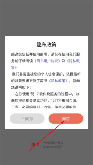 1、在隱私政策彈窗中,點(diǎn)擊同意,進(jìn)入簡(jiǎn)書(shū)APP主頁(yè)面。
