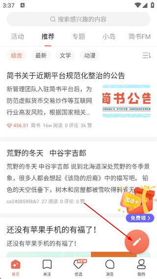 簡(jiǎn)書(shū)是國(guó)內(nèi)領(lǐng)先的閱讀與寫(xiě)作綜合工具,以豐富內(nèi)容資源、簡(jiǎn)潔界面設(shè)計(jì)和強(qiáng)大社交功能為核心特色,用戶可隨手記錄生活,分享文字、圖片或圖文內(nèi)容,同時(shí)平臺(tái)支持個(gè)性化主題與字體選擇,搭配簡(jiǎn)潔易操作的界面,讓閱讀與創(chuàng)作更高效,助力用戶找到專屬的文化交流空間。