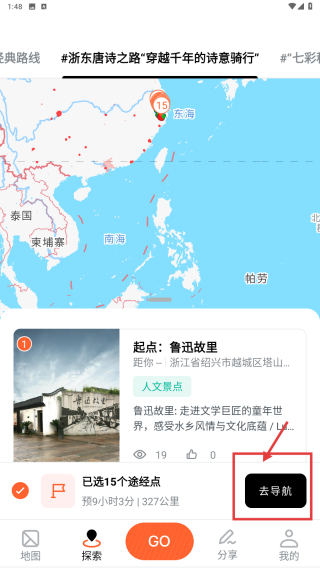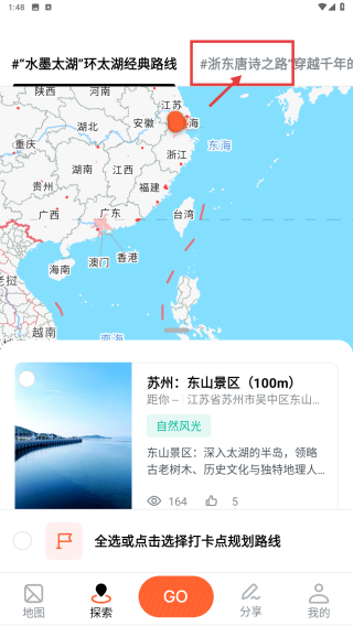 2、在探索頁面,選擇浙東唐詩之路路線標(biāo)簽,查看該路線的打卡點(diǎn)。