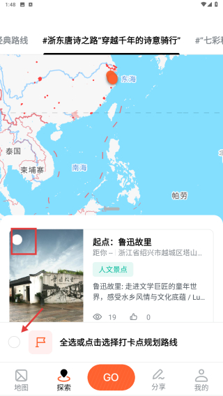 3、在打卡點(diǎn)列表中,選擇魯迅故里打卡點(diǎn),勾選其選擇框。