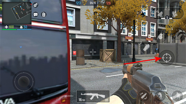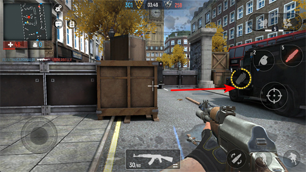 3、使用瞄準(zhǔn)功能,點(diǎn)擊右側(cè)的瞄準(zhǔn)按鈕,開(kāi)啟瞄準(zhǔn)模式,提升精準(zhǔn)度,打擊敵方目標(biāo)。