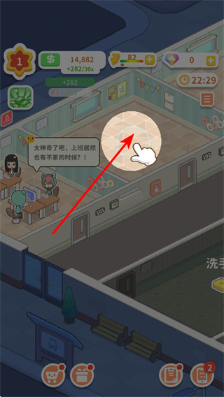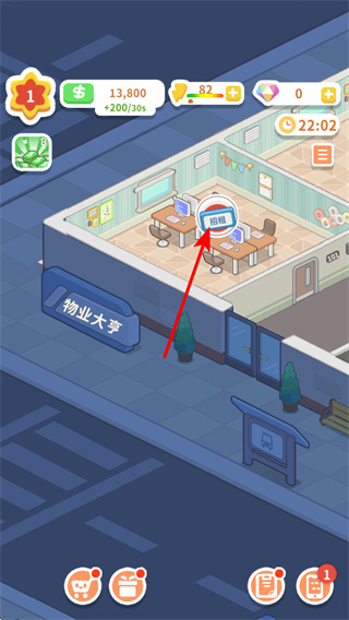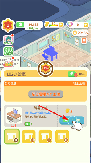 3、拓展辦公區(qū)域,點擊新的辦公室空地,開始建設102辦公室,擴大物業(yè)的經(jīng)營規(guī)模,增加可出租的辦公空間。