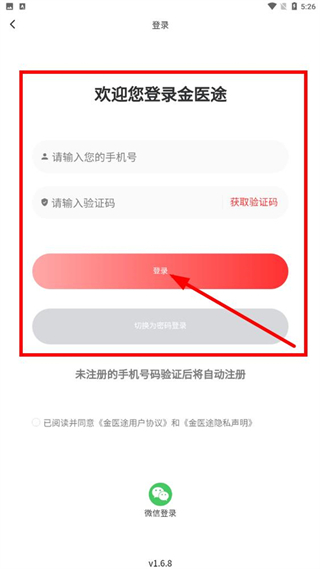 3、在登錄頁(yè)面,輸入手機(jī)號(hào)、驗(yàn)證碼,點(diǎn)擊登錄,完成登錄操作。