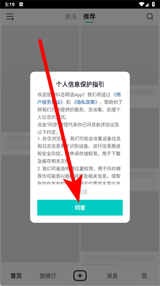 1、打開抖音精選,點擊個人信息保護指引彈窗中的同意。