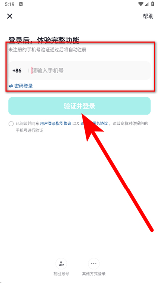 3、在登錄頁面,輸入手機號,點擊驗證并登錄。