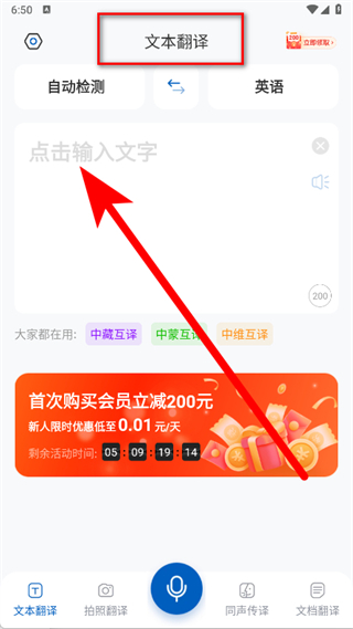 1、打開全球翻譯官,在文本翻譯頁(yè)面,點(diǎn)擊輸入框。