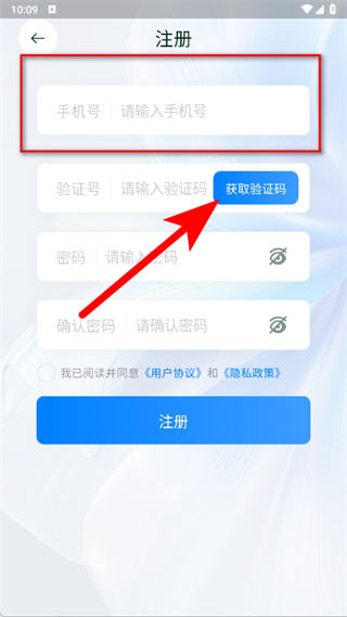 3、跳轉(zhuǎn)到注冊頁面后,在手機(jī)號輸入框中輸入手機(jī)號,點(diǎn)擊獲取驗(yàn)證碼按鈕。