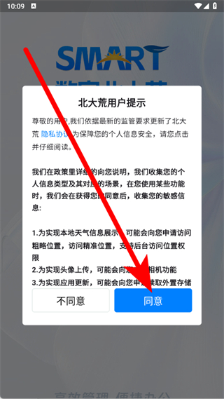 1、打開數(shù)字北大荒,在彈出的北大荒用戶提示彈窗里,點(diǎn)擊藍(lán)色的同意按鈕。