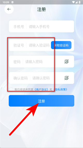 4、在驗(yàn)證號輸入框中輸入收到的驗(yàn)證碼,設(shè)置密碼并在確認(rèn)密碼輸入框中再次輸入密碼,勾選后,點(diǎn)擊藍(lán)色的注冊按鈕,完成注冊。