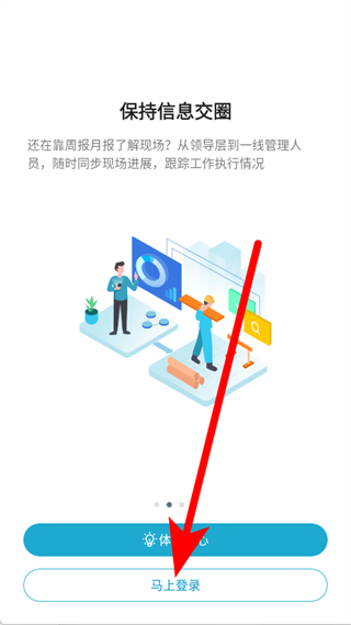 1、打開工程管理,在展示保持信息交圈功能的引導(dǎo)頁,點擊馬上登錄。
