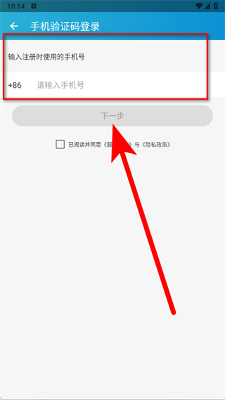 3、在手機驗證碼登錄頁,輸入注冊用的手機號,勾選同意條款后,點下一步。