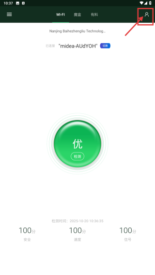 1、打開WiFi檢測(cè)類應(yīng)用,點(diǎn)擊右上角個(gè)人中心圖標(biāo),進(jìn)入我的頁面。