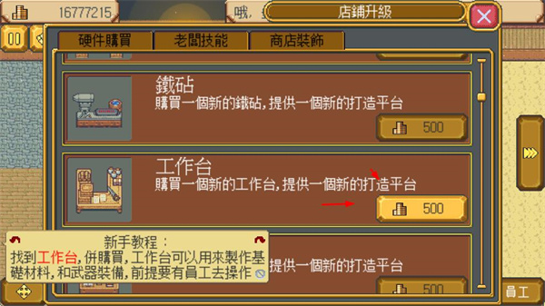 1、在店鋪升級界面,購買硬件設(shè)施,為打造裝備和道具提供平臺,這是經(jīng)營店鋪的基礎(chǔ)操作。