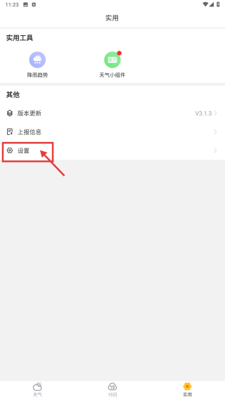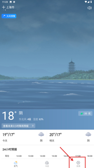 1、打開(kāi)天氣類應(yīng)用,點(diǎn)擊底部實(shí)用選項(xiàng),進(jìn)入實(shí)用板塊。