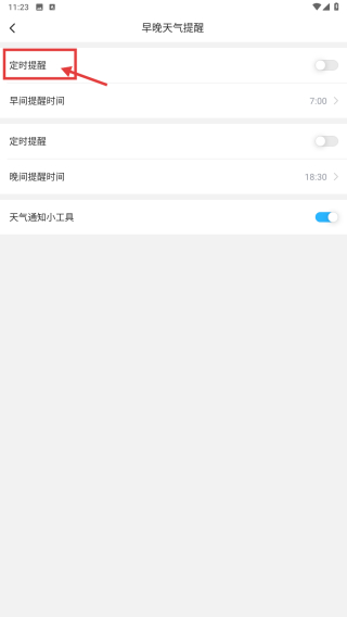 4、在早晚天氣提醒頁(yè)面,找到定時(shí)提醒功能,可根據(jù)需求開(kāi)啟或設(shè)置早間、晚間提醒時(shí)間。