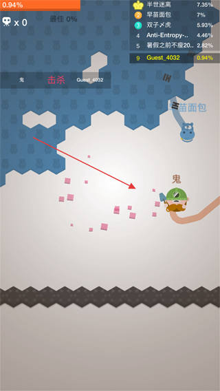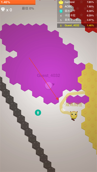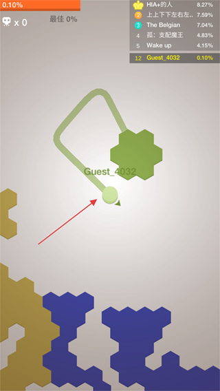 1、進(jìn)入游戲,操控代表自己的Guest_4032圓圈,在六邊形地圖上移動(dòng)來(lái)占領(lǐng)空白區(qū)域,擴(kuò)大自己的勢(shì)力范圍。