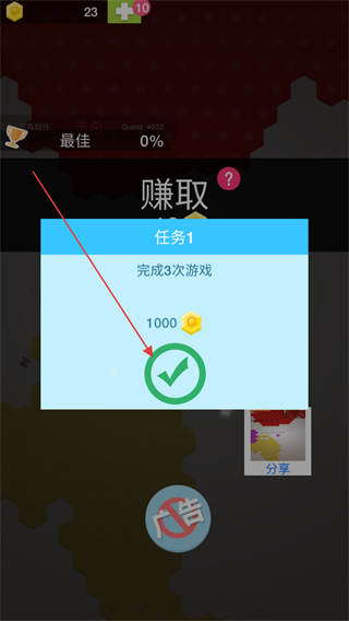 4、完成游戲任務(wù),比如完成3次游戲,點(diǎn)擊任務(wù)界面中的綠色對(duì)勾標(biāo)志,領(lǐng)取相應(yīng)獎(jiǎng)勵(lì)。